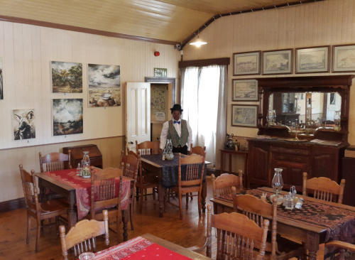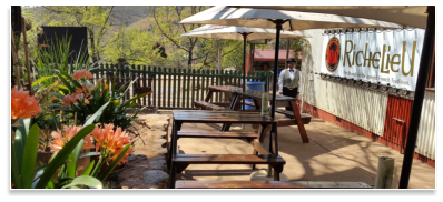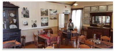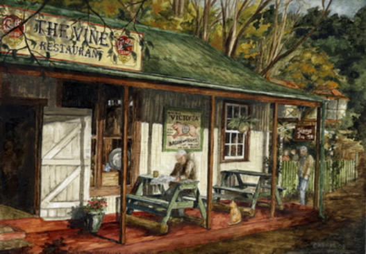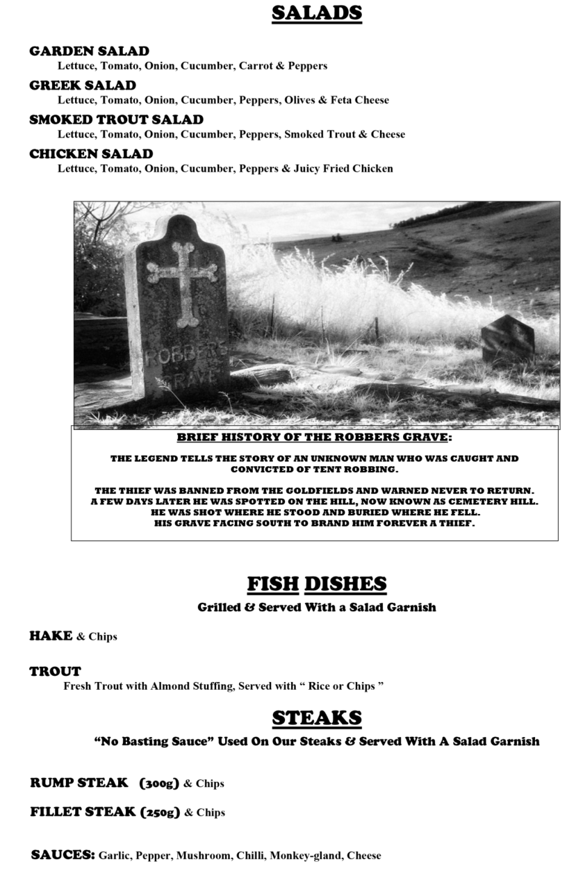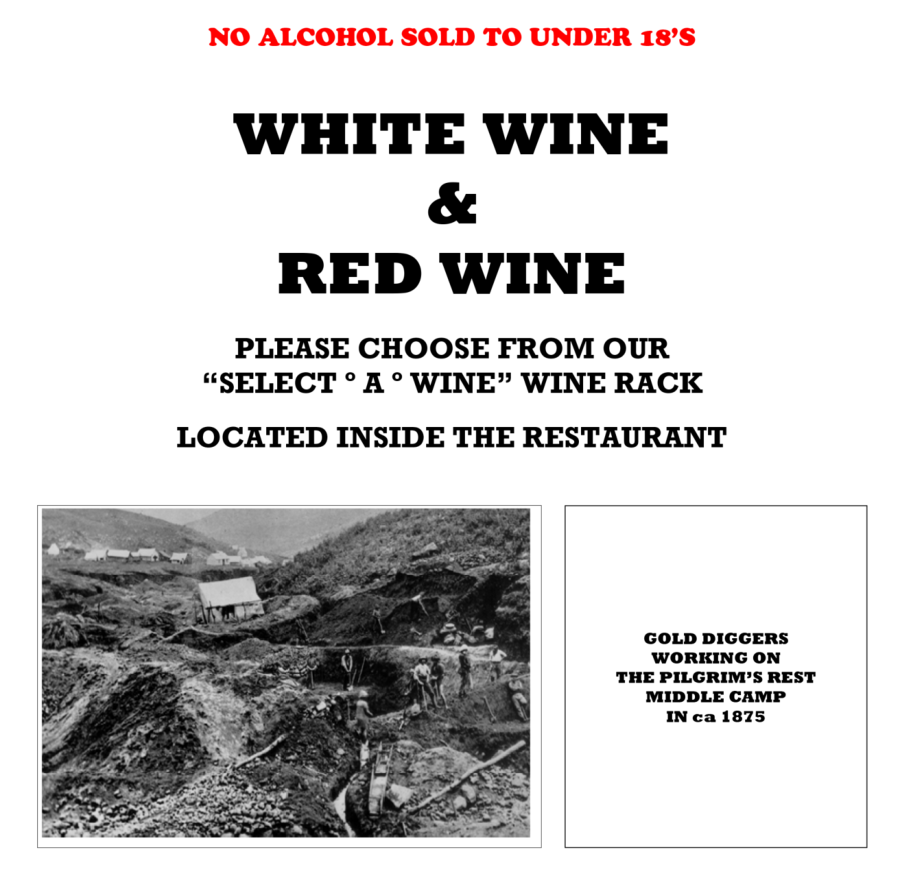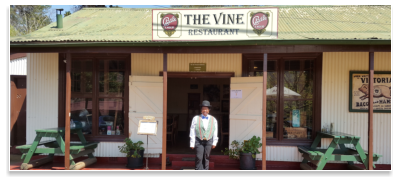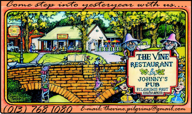 Gold was discovered in 1872, six hours by horse from Lydenburg, by Thomas Mclachlan and partners. This triggered the first gold rush in South Africa and diggers from all over started to flock to what later became Mac-Mac. Alex “wheelbarrow” Patterson left Mac-Mac to prospect and in September1873 discovered the rich gold deposits in the Pilgrim’s Creek……………………………………………………………………..………………………………………………The news of this rich discovery spread fast and soon there were more than a thousand diggers working four thousand claims on the Goldfields. The Pilgrim’s Rest Goldfields yielded hundreds of thousands of Rand’s worth of gold and nuggets weighing up to 6kg were regularly found. The alluvial gold petered out by 1879 and the diggers had to start digging into the inter-bedded reefs. Smaller mining companies were formed to finance the mining ventures. In 1881, David Benjamin a London financier bought the mining concession from the Zuid-Afrikaanche” Republic for the farm on which Pilgrim’s Rest in situated. Benjamin compensated the diggers and the alluvial mining era came to an end. Most of the diggers left for the newly discovered gold deposits at Barberton.……………………………………………………………………..………………………………………………Benjamin’s company the Transvaal Gold and Land Exploration Company was in full production by 1882. The first hydro-electric power station was built in 1884 to supply electric power to the Brown’s Hill Plant. An electric tramline was built to transport the ore from all the different outlying mines to the Central Reduction Plant in Pilgrim’s Rest.……………………………………………………………………..………………………………………………In 1896, The Transvaal Gold and Land Exploration Company amalgamated with the smaller mining companies to form the Transvaal Gold Mining Estates. TGME mined in the Pilgrim’s valley until 1972 and sold the village and the farm on which it is situated to the South African Government, but they retained the mineral and mining rights. In 1986 the gold price increased and mining operations started again, making TGME the oldest existing gold mining company in South Africa.……………………………………………………………………..………………………………………………At the height of the Gold Rush, thirteen pubs catered for the digger’s thirsts, some of which wereNamed: The Halfway House, Yorkies, the Alhambra Palace, Tom Craddock’s Bar, Square face,The Spotted Dog, Stent’s Cathedral and The Vine.……………………………………………………………………………………………………………………..The original Vine was established in 1874 as an Eating House / Pub on the Pilgrim’s Rest Goldfields. It was situated near the Theta Mine Battery site. The building, the present house, The Vine was built in 1904 as a General Dealers.